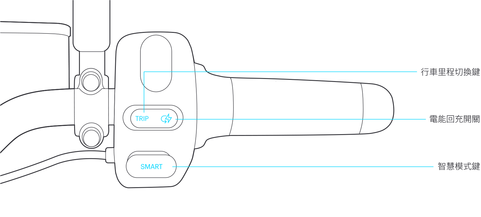 | 電能回充開關 | 當馬達啟動時,此按鍵可以開啟或關閉電能回充功能。 | |